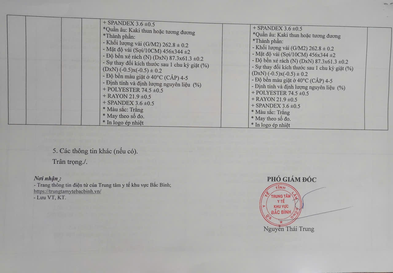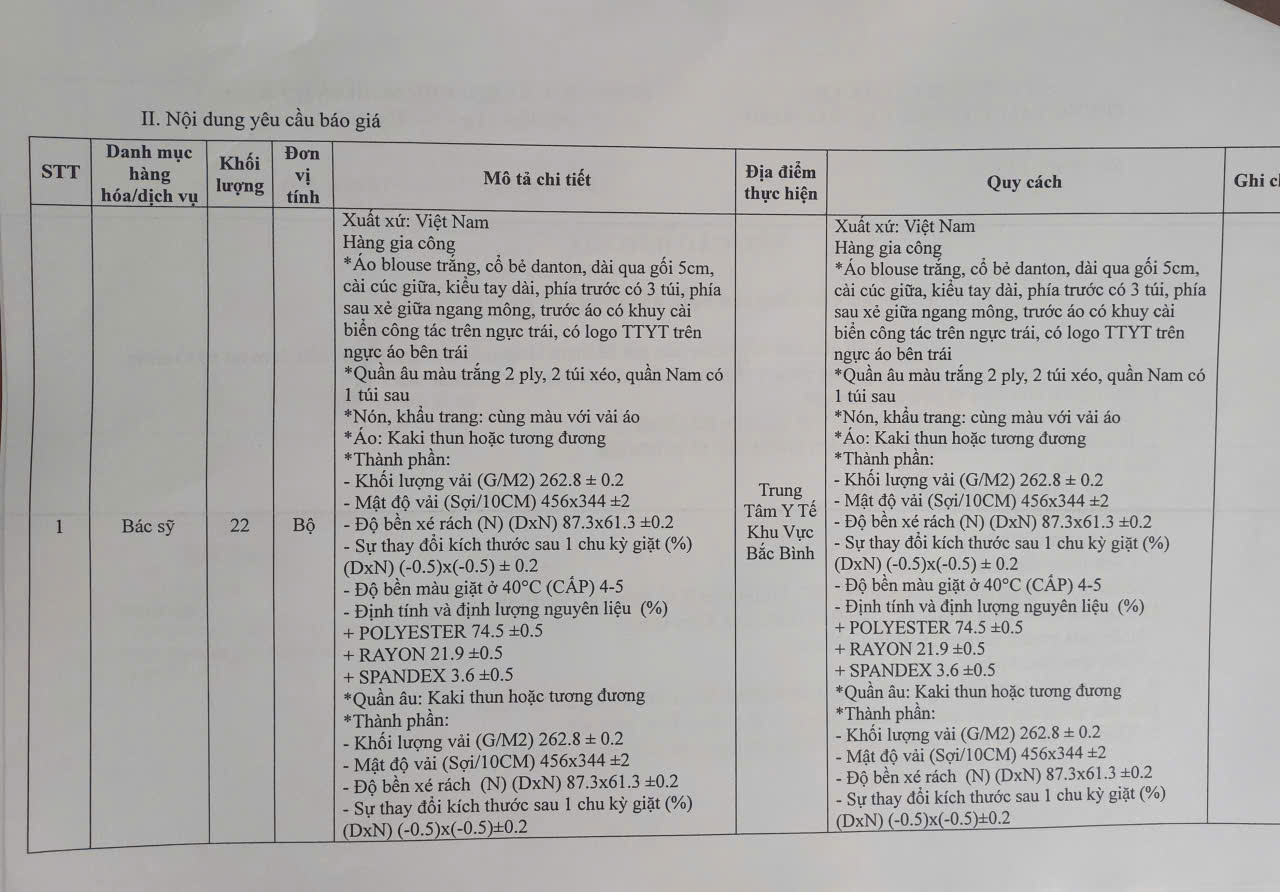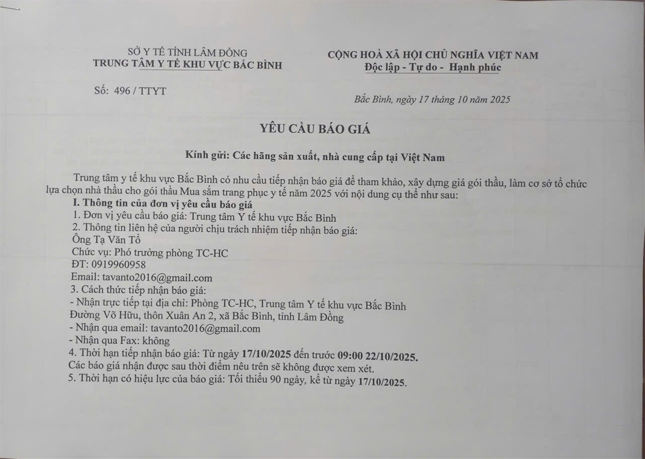 Thông báo YÊU CẦU BÁO GIÁ TRANG PHỤC Y TẾ 14 Đã xem 17/10/2025 Ngày đăng: 17/10/2025 File đính kèm: Tải về Thông tin chi tiết Thông báo khác YÊU CẦU BÁO GIÁ TRANG PHỤC Y TẾ ( 17/10/2025 ) Thông Báo Yêu cầu Báo Giá Trang Thiết Bị Y tế ( 16/09/2025 ) Thông báo yêu cầu báo giá trang thiết bị Chương trình "Cải thiện dinh dưỡng" ( 09/09/2025 ) Yêu cầu báo giá ( 03/09/2025 ) Yêu cầu báo giá vật tư hóa chất sinh phẩm phục vụ công tác chuyên môn ( 01/08/2025 ) Thông báo về việc mời đơn vị tham gia tư vấn; lập hồ sơ mời thầu. đánh giá hồ sơ dự thầu....mua sắm đường sữa phụ cấp độc hại hiện vật cho viên chức và người lao động năm 2024 ( 17/12/2024 ) Thông báo mời đơn vị tham gia tư vấn lập hồ sơ mời thầu, đánh giá hồ sơ dự thầu,,gói thầu mua sắm trang phục y tế năm 2024 ( 17/12/2024 ) Báo giá mua sắm trang phục Y tế ( 30/10/2024 ) Yêu cầu báo giá bảng pano truyền thông " xét nghiệp phát hiện sớm HIV, Viêm gan B và Giang mai ở phụ nữ mang thai" ( 19/09/2024 ) Yêu Cầu Báo Giá ( 18/09/2024 )